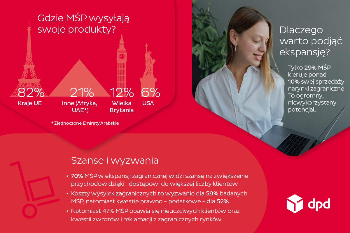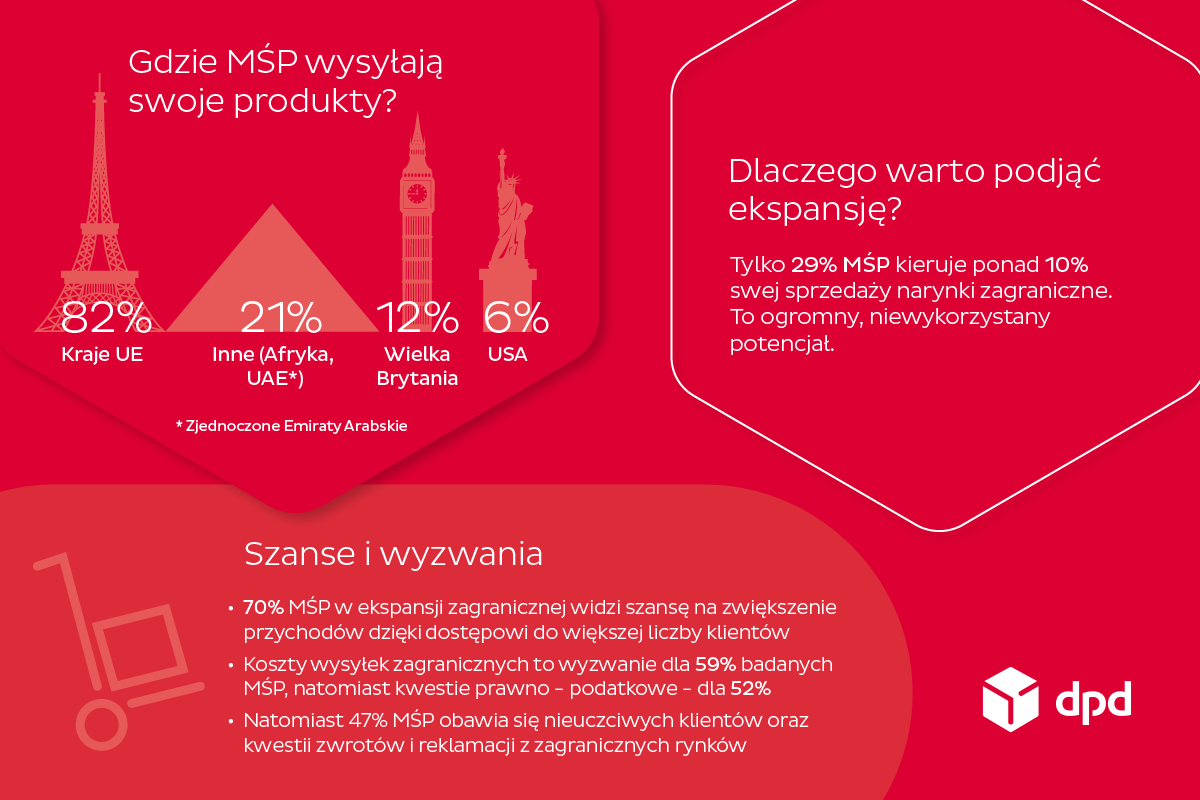 Decyzja o uruchomieniu platformy czasnaeksport.eu była naturalnym następstwem wniosków płynących z raportu „Trendy w sektorze MŚP i e-commerce” DPD Polska, który przedstawił skalę wyzwań i szans stojących przed polskimi przedsiębiorcami. Już 70 proc. firm z sektora MŚP dostrzega w ekspansji zagranicznej możliwość znaczącego zwiększenia przychodów, a aż 82 proc. tych, którzy już to robią, wybiera na ten cel kraje UE. Z drugiej strony wartość prowadzonego „cross-border commerce” ujawnia ogromny, wciąż niewykorzystany potencjał – jedynie 29 proc. przedstawicieli MŚP kieruje część swojej sprzedaży poza Polskę. Ankietowani przedsiębiorcy wskazują w tym miejscu na konkretne bariery: 59 proc. obawia się kosztów wysyłek międzynarodowych, 52 proc. trudności prawno-podatkowych, a 47 proc. – ryzyka związanego z nieuczciwymi klientami czy zwrotami z zagranicy.